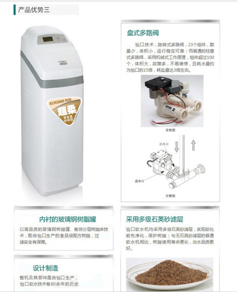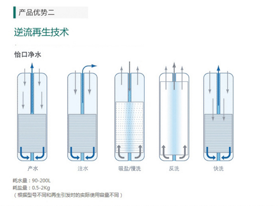 专利的逆流再生系统,再生时比同类产品省33%再生剂,省65%的水。